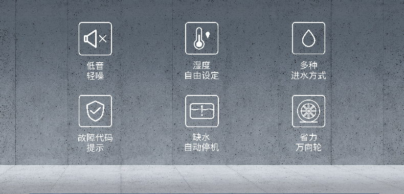 ·水桶水管兩種進(jìn)水方式·濕度可自由設(shè)定·缺水自動停機(jī)·風(fēng)機(jī)延時保護(hù)